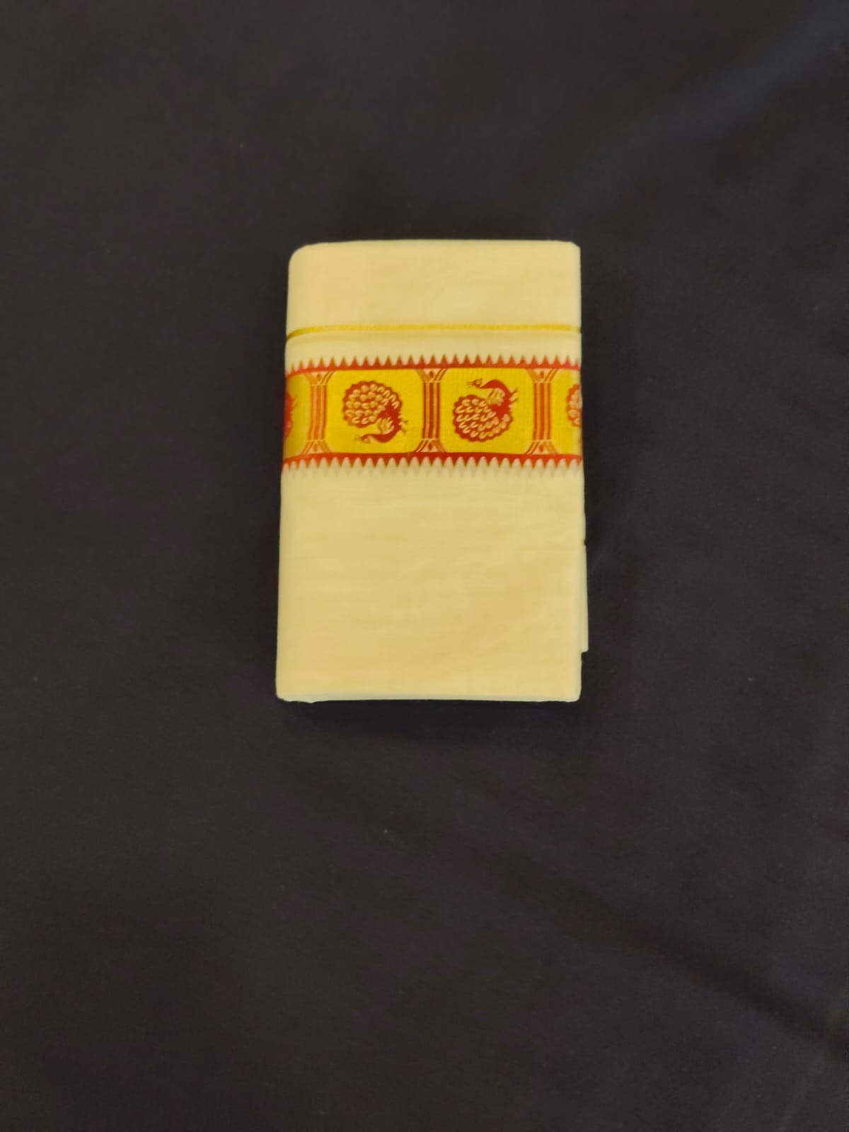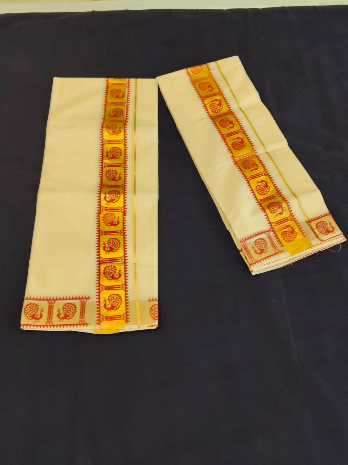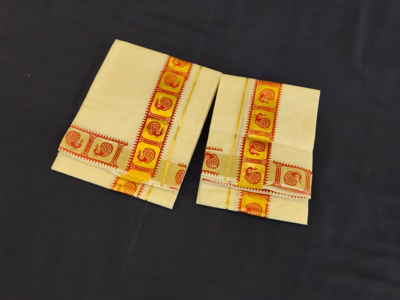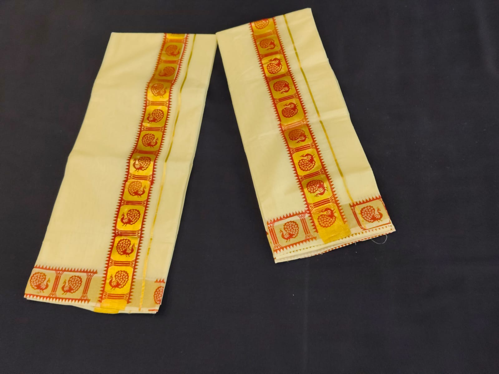 BORDER 2.5 INCH RED COLOR WITH GOLDEN KASAVU AND PEACOCOK PRINT COMBINATION